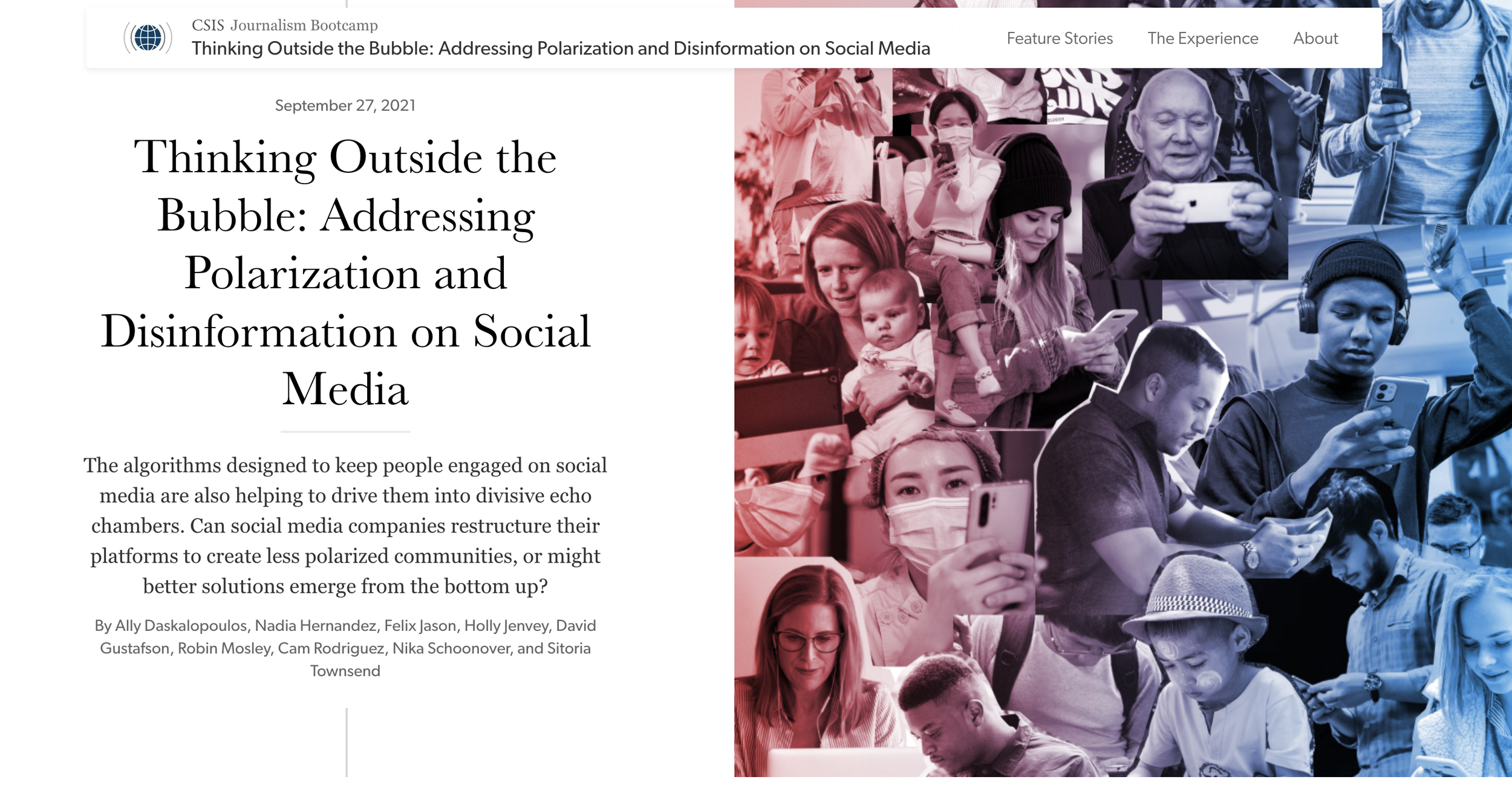 Investigating the Digital Divide: An Integrated Media Exploration of Black Twitter and Social Media Polarization. Utilizing Adobe InDesign and Premiere Pro, our team crafted a compelling multimedia narrative examining online community dynamics, ultimately presenting our research to White House constituents. Our project dissected how social media algorithms create echo chambers and proposed innovative solutions for more connected digital spaces.